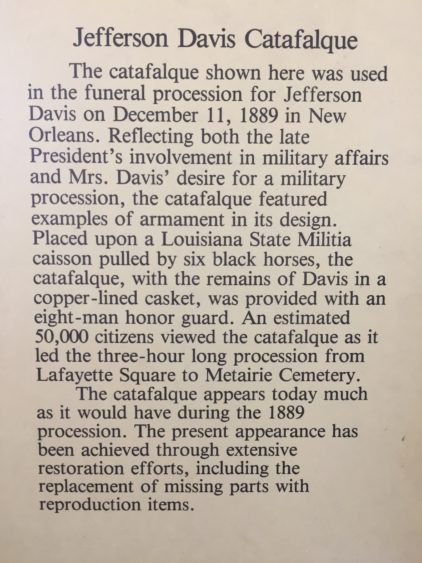 The “catafalque” was used in the funeral procession of Jefferson Davis on December 11, 1889 in New Orleans.