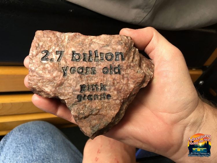 Throughout the tour, they showed us many historical photos and passed around various artifacts. This is a chunk of pink granite from the area said to be 2.7 billion years old.